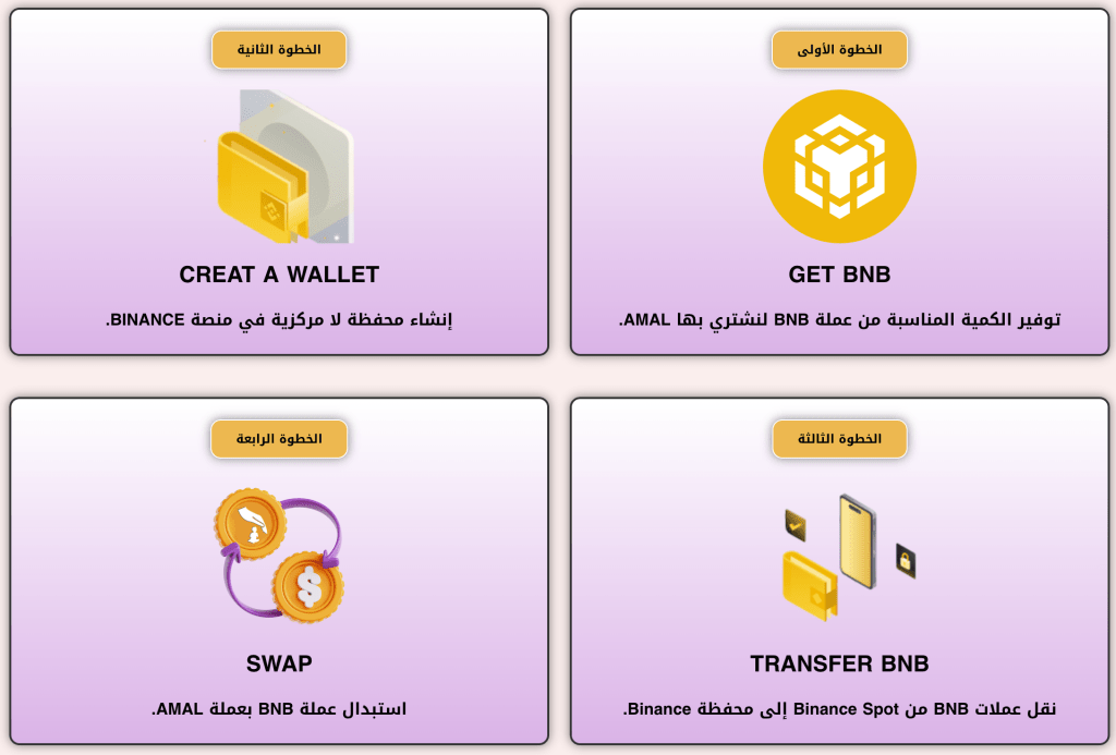 تم التركيز في هذه الصفحة على شرح إجراءات شراء AMAL مع الفيديوهات باستخدام محفظة Trust Wallet ومحفظة Binance Web3، وذلك لما لكل محفظة من مميزات. إلا أنه يمكن شراء AMAL بعملة BNB أو USDC باستخدام أي محفظة عملات مشفرة، وذلك من خلال ربط المحفظة في تطبيق AMAL SWAP عبر الضغط على الأيقونة في الأسفل.
