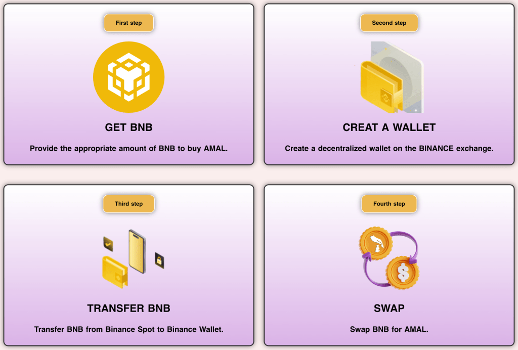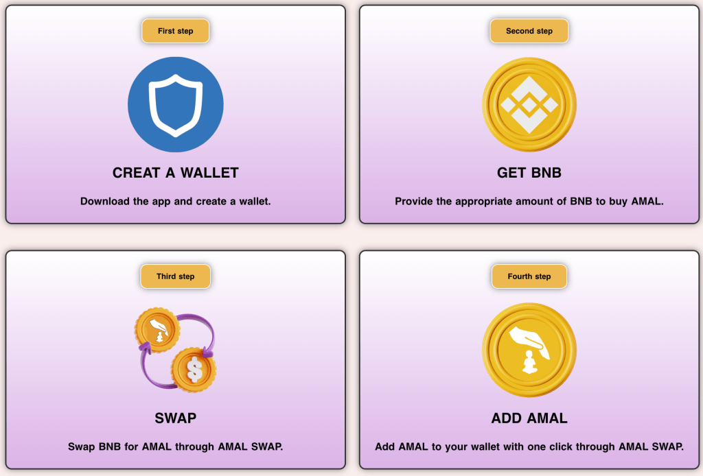 This page provides instructions for purchasing AMAL using Trust Wallet and Bianance Web3 Wallet. However, AMAL can also be bought using BNB or USDC with any cryptocurrency wallet by linking the wallet to the AMAL SWAP application. Click on the icon below to get started.